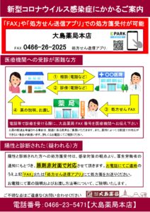 株式会社大島薬局では、新型コロナウイルス感染症陽性者の方の処方せん受付につきましては、感染拡大防止の観点から、原則非対面で実施しております。