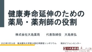• 日頃よりお世話になっております横浜薬科大学の先生方が実行委員として開催されます「第24回応用薬理シンポジウム」にて「健康寿命延伸のための薬局・薬剤師の役割」についてお話させて頂きました。