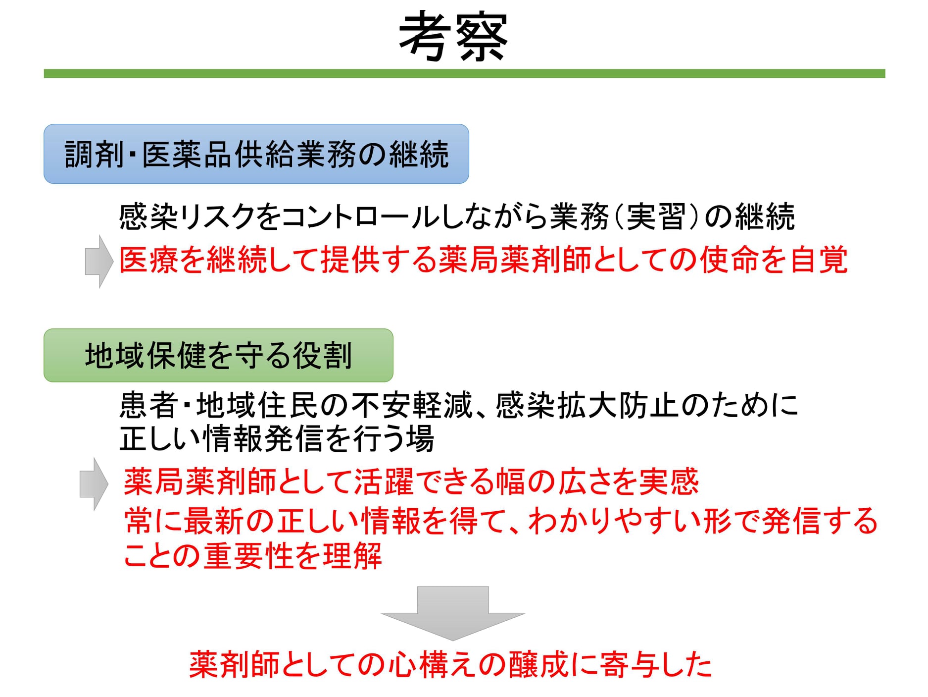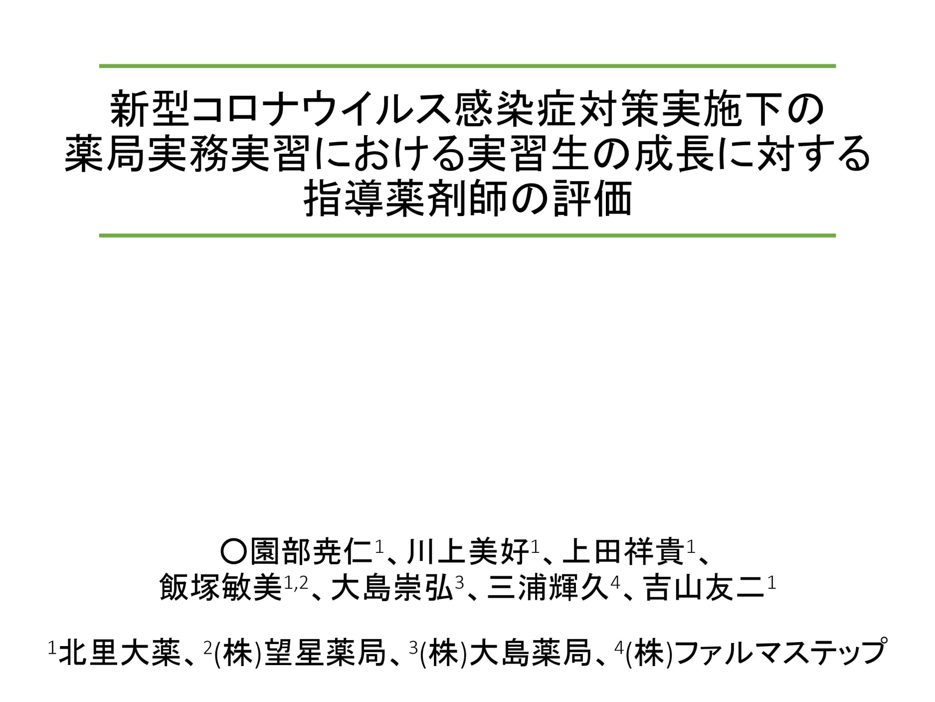 第63回日本薬学会関東支部大会 にて、本年度1期実務実習での「いわゆるコロナ禍における実習」について、北里大学保険薬局学教室の一員として発表いたします。 コロナ禍だからこそ、改めて薬局薬剤師が「地域保健を守る」重要な役割を担っていることを再確認して頂きたいと願っています。 大島崇弘