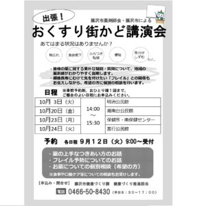 藤沢市と協働して「ポリファーマシー啓発事業」を実施しました。藤沢市薬剤師会では「薬剤性フレイル(多剤服用によって副作用等でフレイル悪化を来すリスク)」を啓発しています。薬や健康の事でお困りの際は、かかりつけ薬剤師にご相談くださいね(^_-)-☆